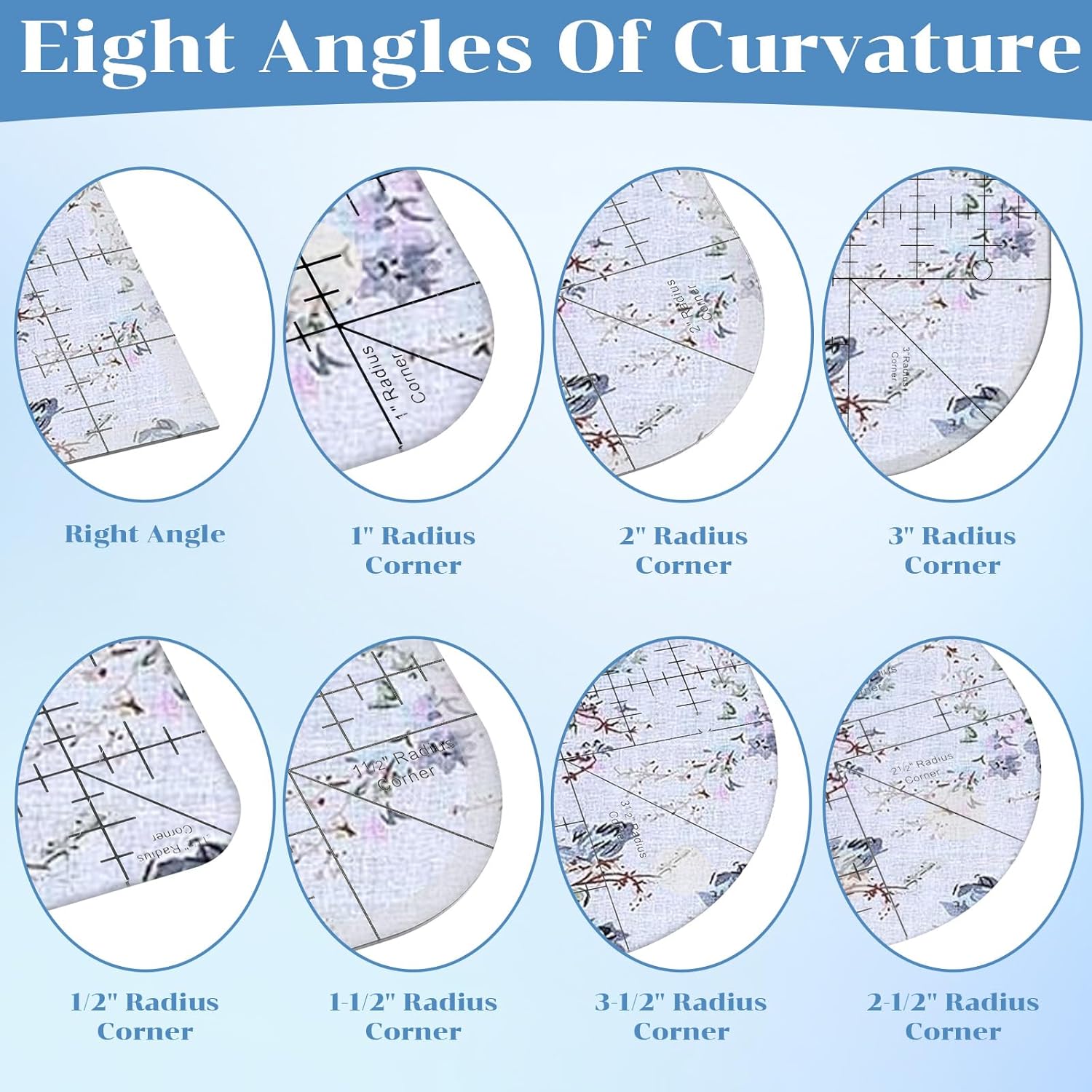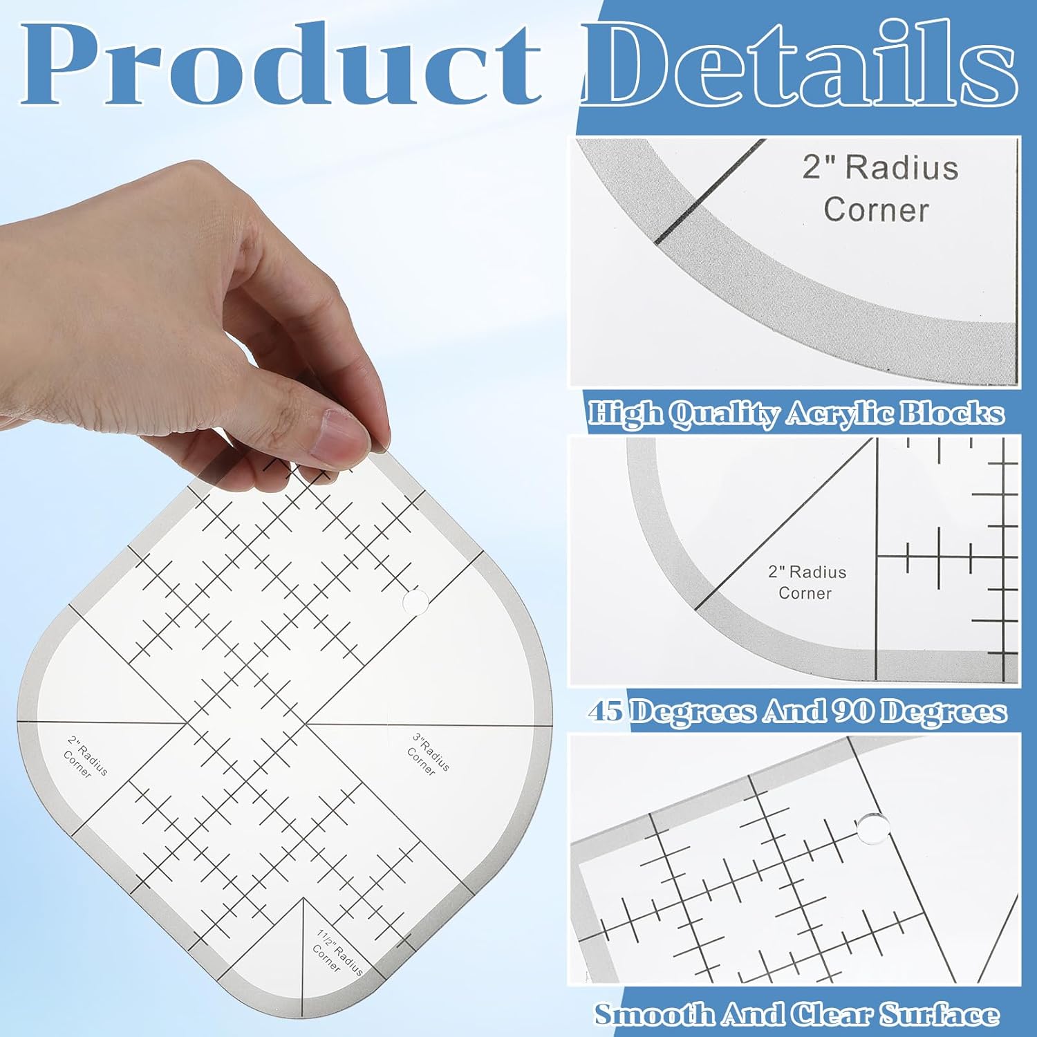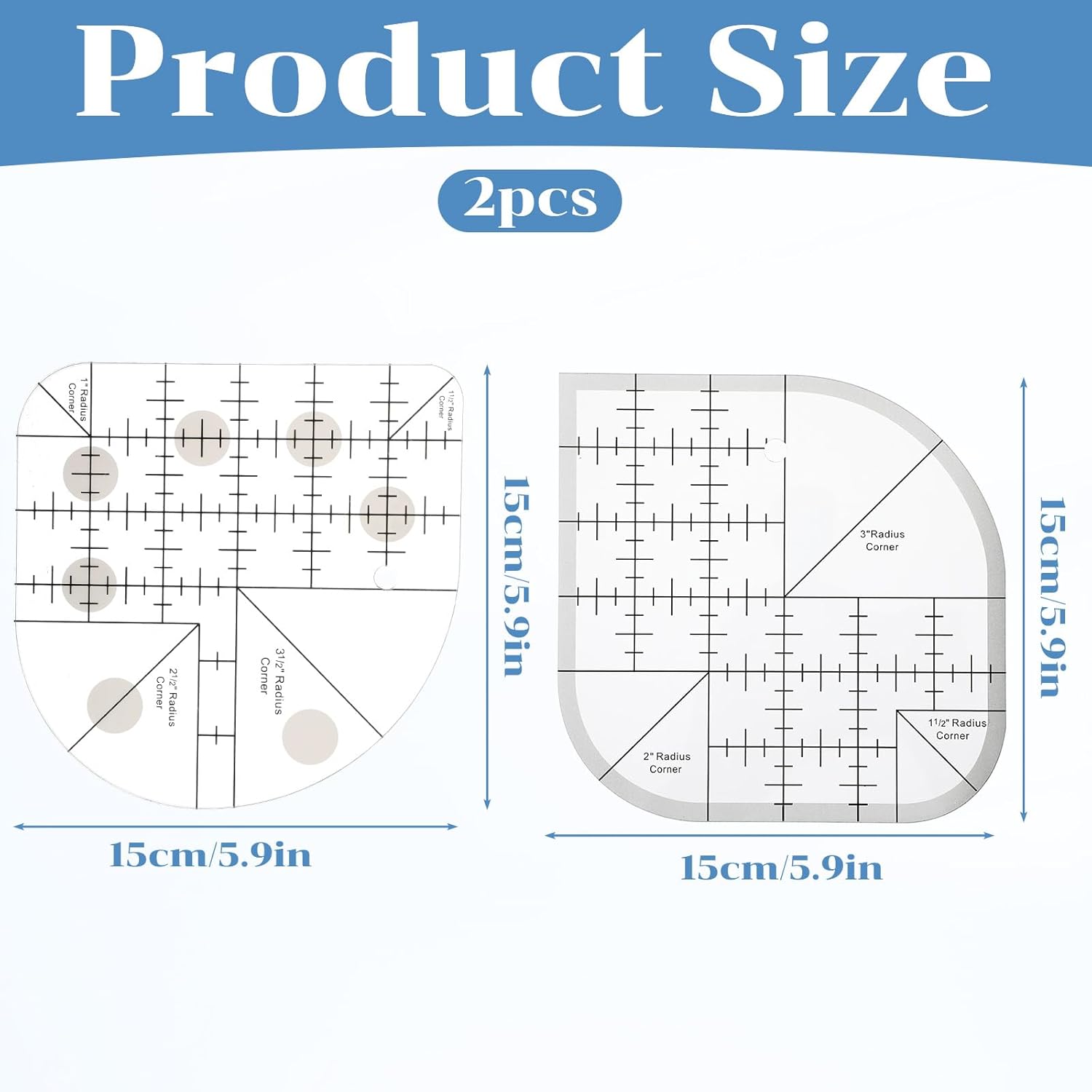 - 【Package Includes】: You will receive 2 pieces of acrylic corner quilting rulers. Each sewing ruler measures 15 x 15 cm/5.9 x 5.9 inches, with a thickness of 0.3 cm/0.12 inches. The set comes with 8 types of curves, including curves with radii of 1/2, 1, 1-1/2, 2, 2-1/2, 3, 3-1/2 inches and a right angle