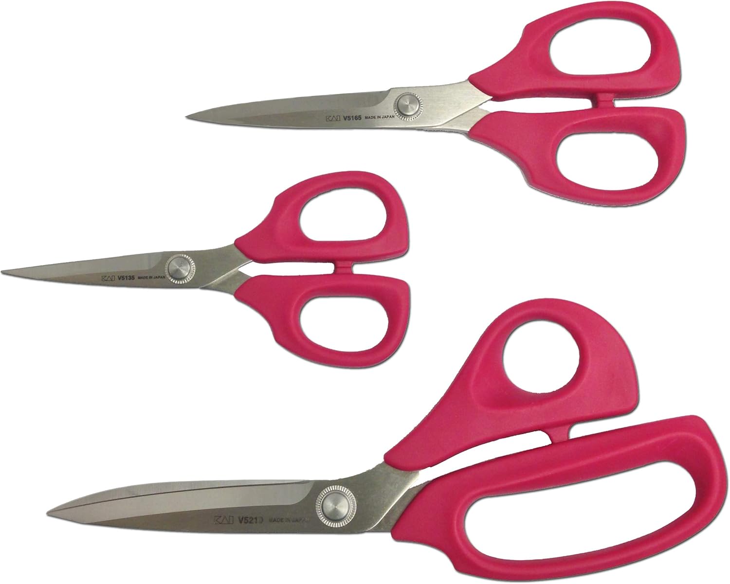 • This set includes: 1 pair of V5135 (5 1/2″ Embroidery Scissors), 1 pair of V5165 (6 1/2″ Sewing Scissors), 1 pair of V5210 (8″ Dressmaking Shears).