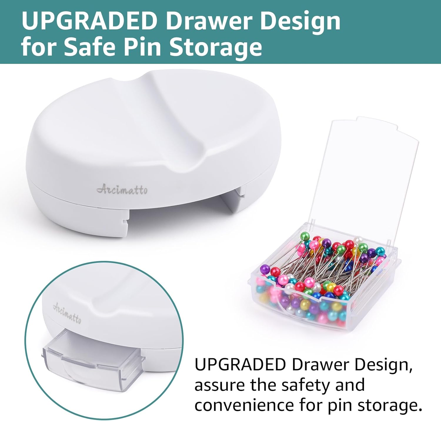 Arcimatto Magnetic Pin Holder, Strong Magnet Pincushion with Drawer, Pin Cushion with 100 Pcs Ball Head Straight Pins for Sewing, Needle Cushions, Bobby Pin Holder, Paper Clip Organizer
