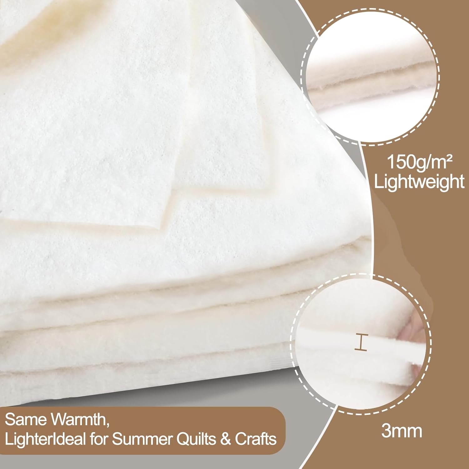 - 150G/M² LIGHTWEIGHT & VERSATILE: 30% thinner than traditional cotton batting yet warm enough for year-round use. Ideal for summer quilts, bowl cozies, and wall hangings. Choose from 4 sizes (40″x40″ to 108″x96″) to fit any project.