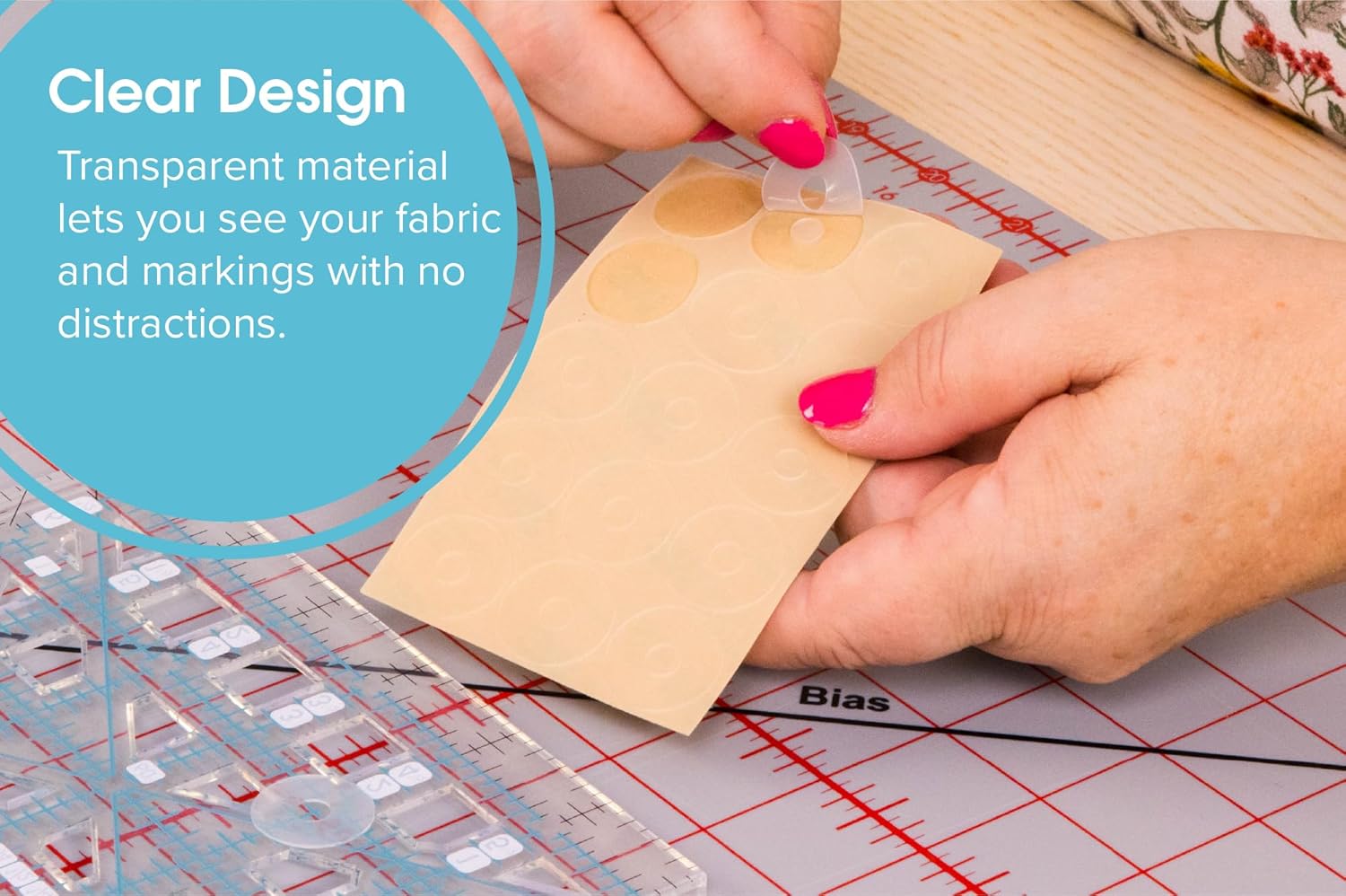 - Transparent – These transparent grips allow you to keep your eyes on your project at all times, providing greater ease and accuracy while cutting and sewing.